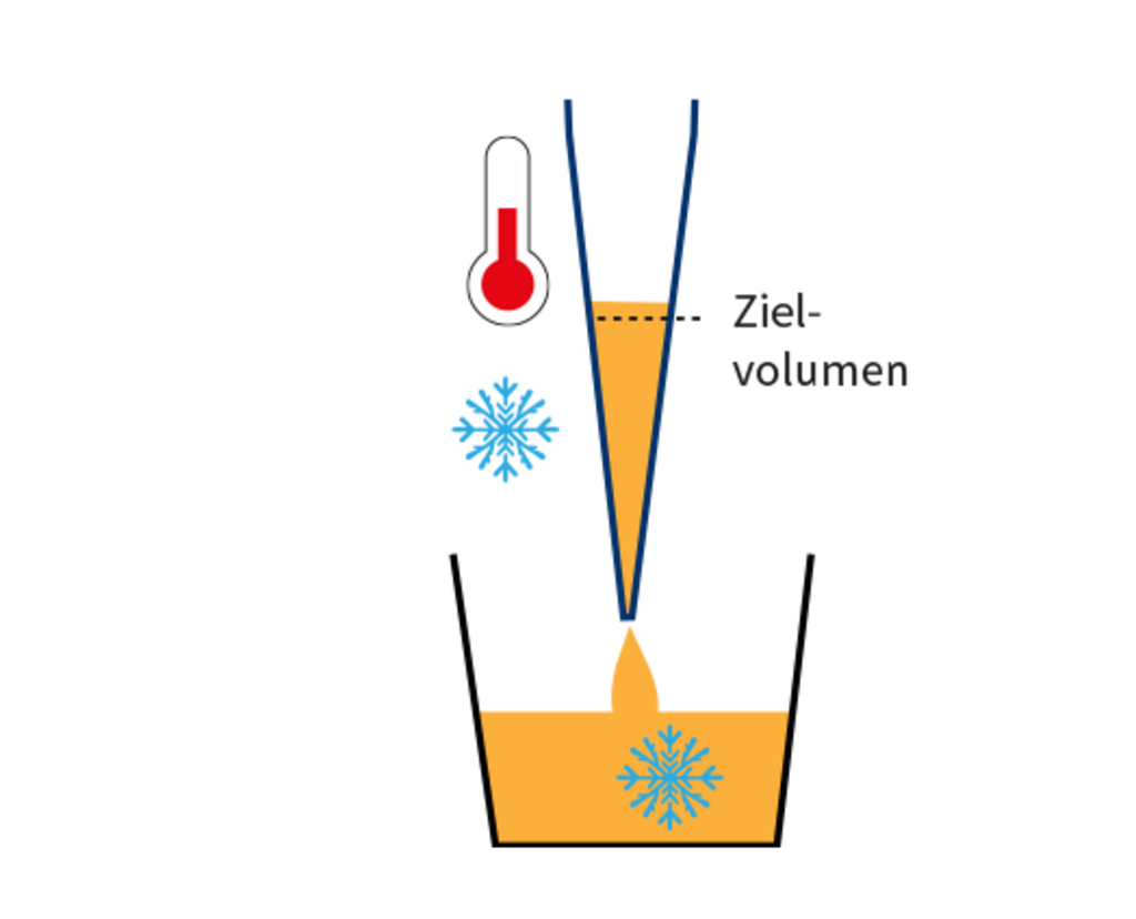Die Volumenaufnahme bestimmt, wie viel Flüssigkeit tatsächlich abgegeben werden kann, und ist besonders fehleranfällig. Eine schräg eingetauchte Pipettenspitze verändert den hydrostatischen Druck in der Spitze und kann zusammen mit einer falschen Eintauchtiefe die Volumengenauigkeit beeinträchtigen. Je nach Zielvolumen benötigt die Pipette mehr oder weniger Zeit, um die Flüssigkeit vollständig anzusaugen.
