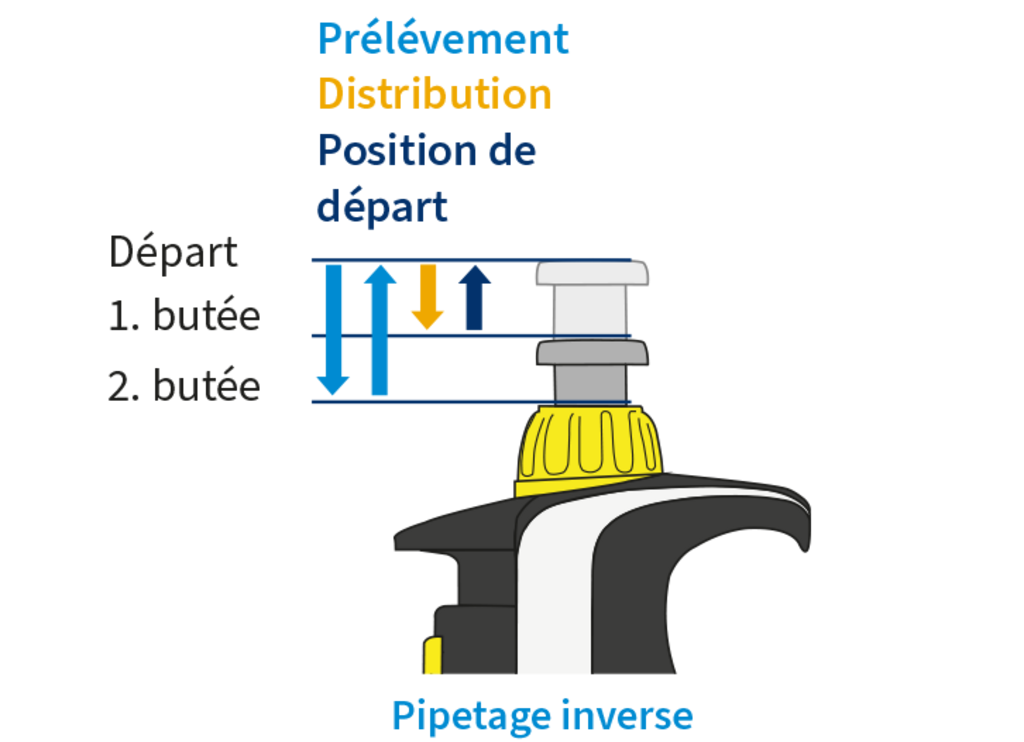 Lors du pipetage inverse, le bouton de pipetage est enfoncé directement jusqu’au deuxième point de résistance.